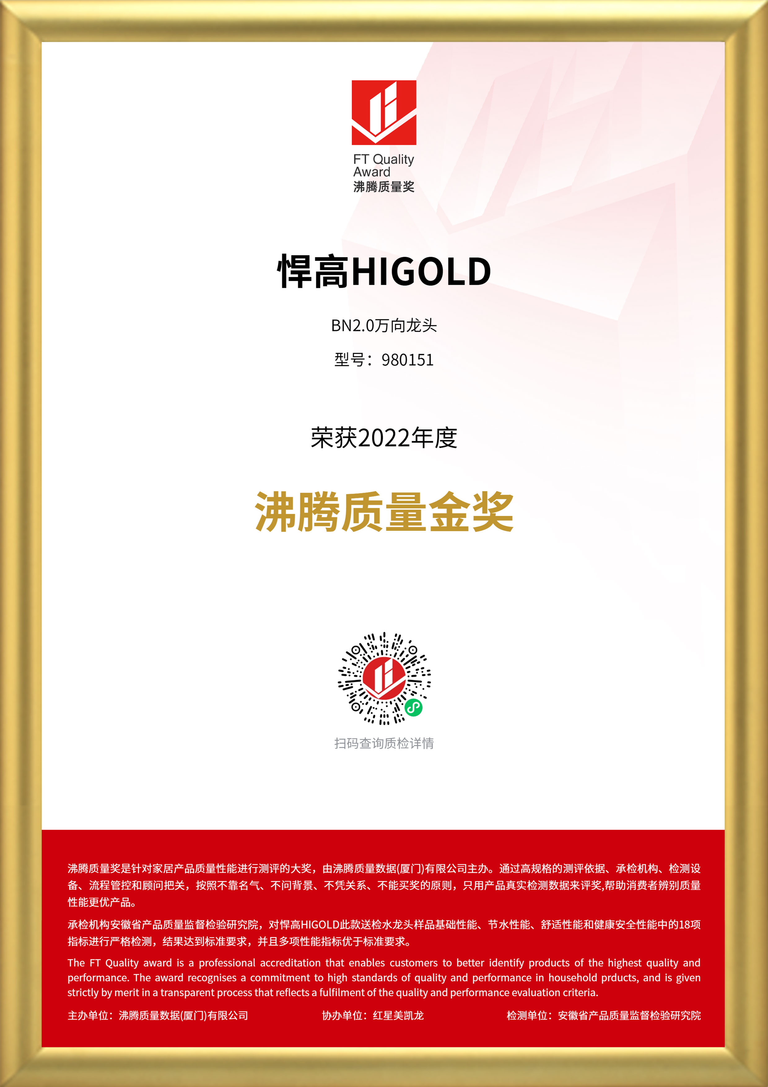 “沸腾质量奖”是针对家居产品质量性能进行测评的大奖,通过聚焦消费痛点,以高规格的测评依据,承检机构,检测设备,流程管控和顾问把关,秉持客观,严谨,公正的态度和“精工品质 用数据说话”的宗旨,筛选质量性能更优的家居好产品 鉴黄师最新版,其中,“沸腾质量金奖”是沸腾质量奖测评中的重磅奖项,代表了该品类当前质量风向标。