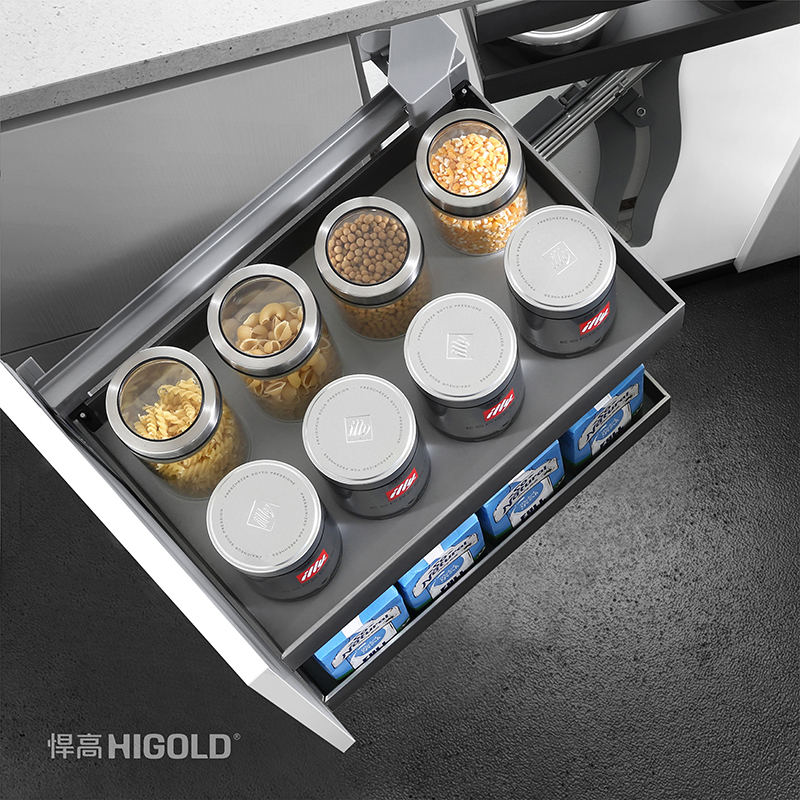 设计:分体联动设计,实现所有物品拉出柜体,即使最里面的物件,也可轻松存取,二级高度调节 手机app下载站,满足不同高度的厨房物品,三维快速调节,让门板无缝贴合。
